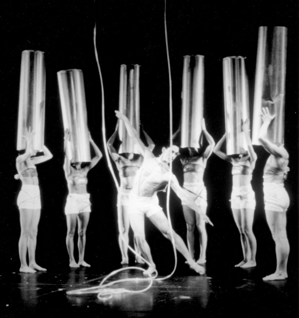 The aluminum tubes were exceptional objects, instruments, partners for the work titled Rolling Thunder. Silver aluminum tubes, were not only beautiful objects on stage, but had various characteristics and potentials as partnering with dancers: dancers put their heads into the tube, sang and made vocal sounds. Silver tubes became an eloquent head dress; when tubes were rolled and played (pounded) they created a threatening sound and sound became thunderous. Tubes, when played, became the voice of a drum, and in unison, like rolling thunder. The concept of the tubes is a warning to the human race in regards to survival of man or survival of planet earth as we know it.