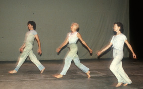 Time Dance – An evening-length performance for five dancers based on structures of pulse and accumulation. A metronome provided the repetitive pulse during all rehearals. Dancers mastered snapping the finge rs keeping with the pulse while walking and changing direction, stopping and starting, becoming at ease with moving through space with a large dance walk, intersecting and moving with other dancers in and through the space. Sometimes moving into a run, doubling the counts 1&a, 2&a, etc. Stopping and improvising….begin ning to finding choreography to the pulse.