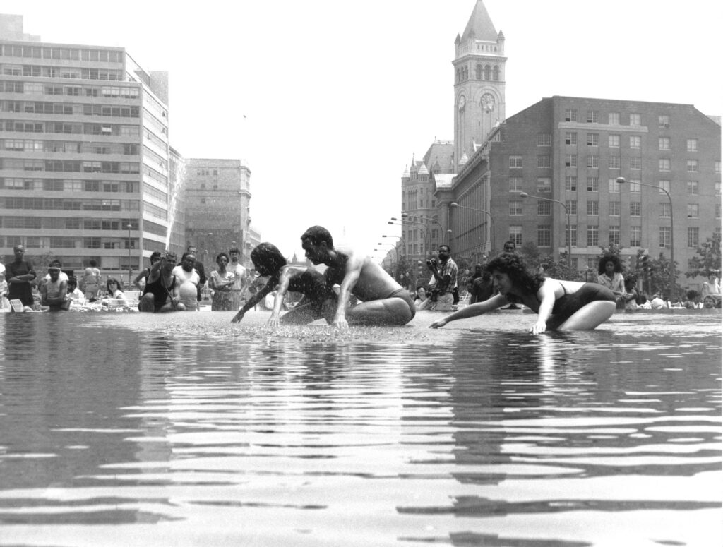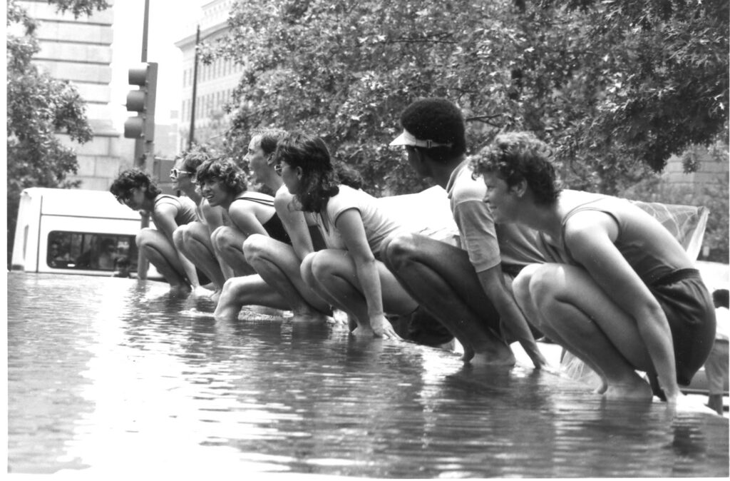 (1983) June 24 Wet and Wonderful in Washington, DC (Western Plaza) – a dance, music, and water sculpture event at National Freedom Plaza, Pennsylvania Avenue toward the Capital Building, conceived by Maida Withers and constructed in collaboration with MWDCCo dancers, John Bailey and Susan Jamieson, Susan Short Benzinger, Matthew Brown, along with invited DC community dancers. Susan Jamieson was involved in creation of magical monsters using large sheets of clear plastic.